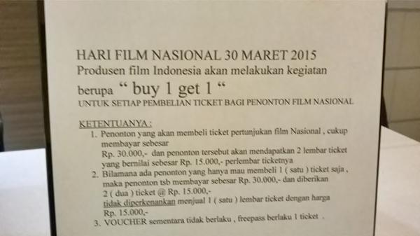 Selain memutar film Soekarno, pihak bioskop memberikan diskon khusus setiap pembelian tiket film Indonesia. Beli satu dapat satu tiket, alias 2 tiket untuk satu pembayaran.